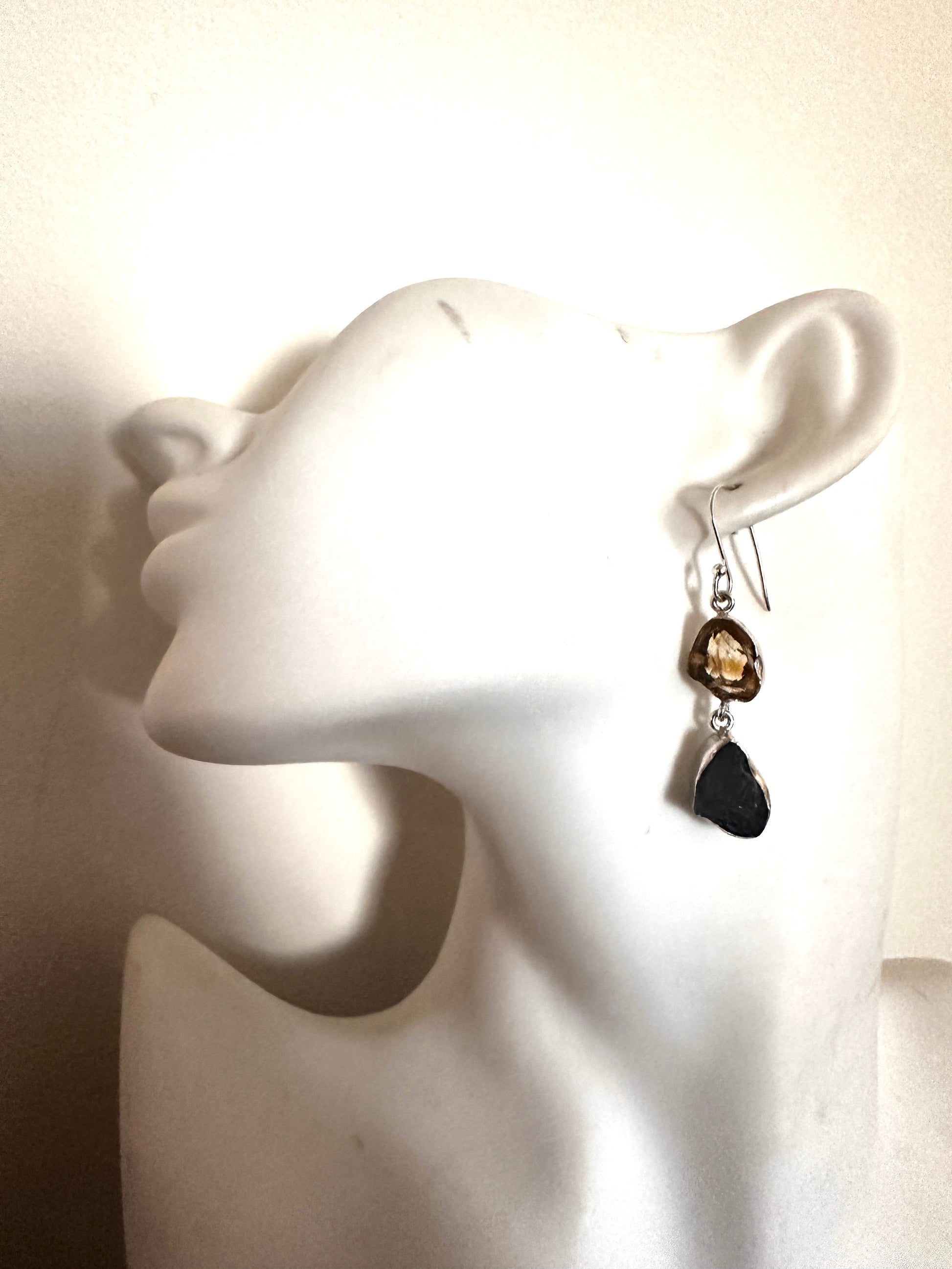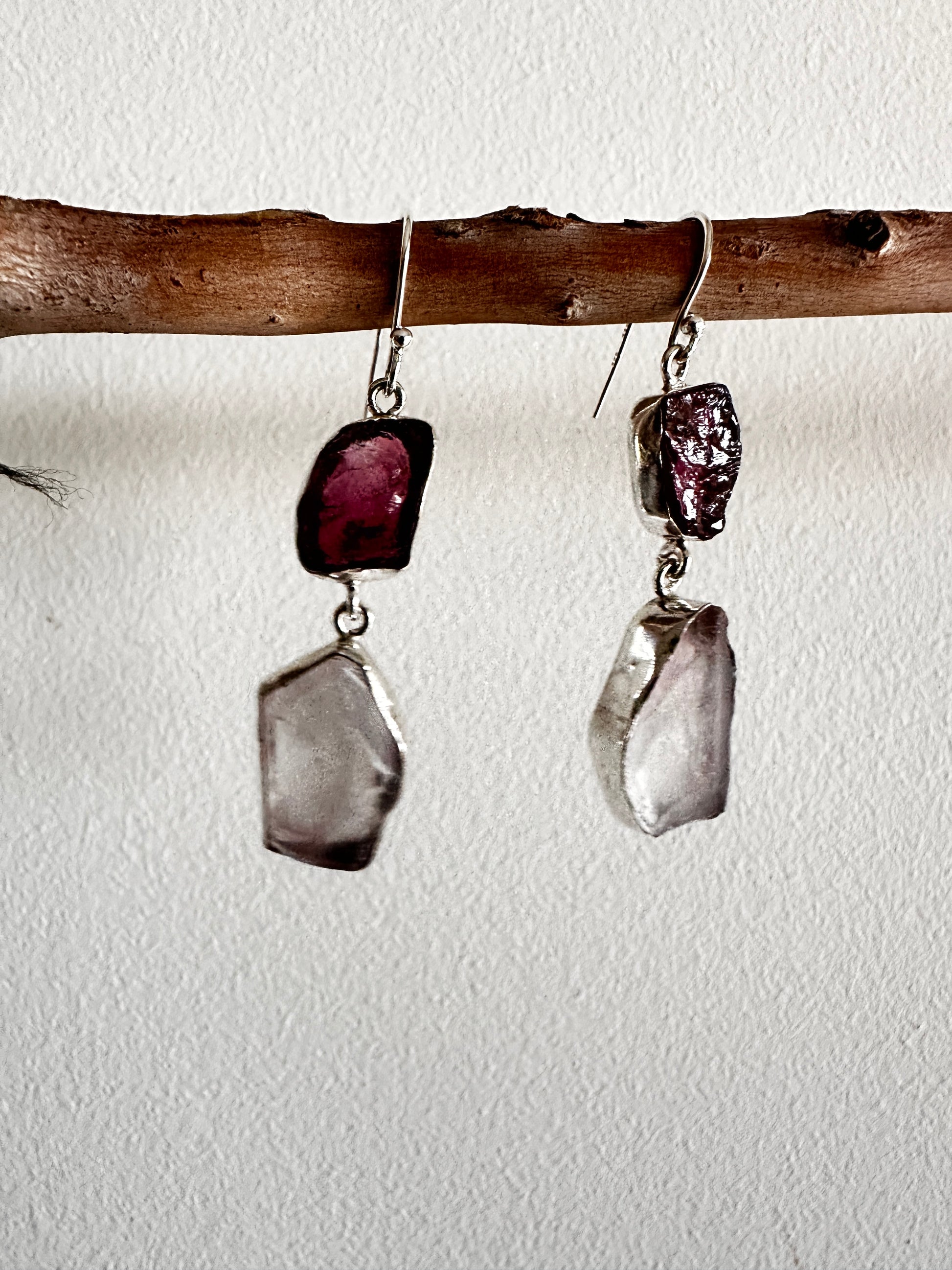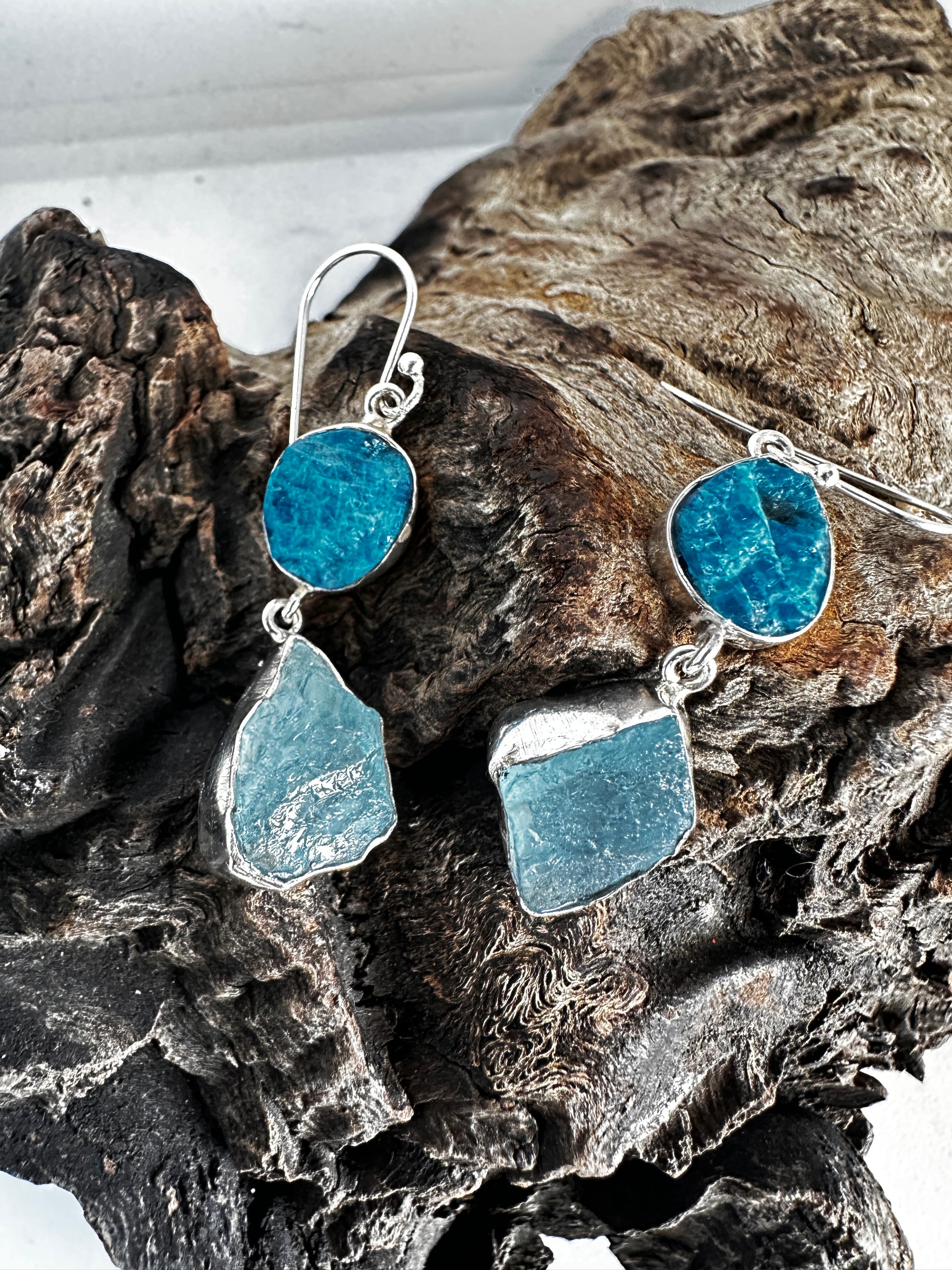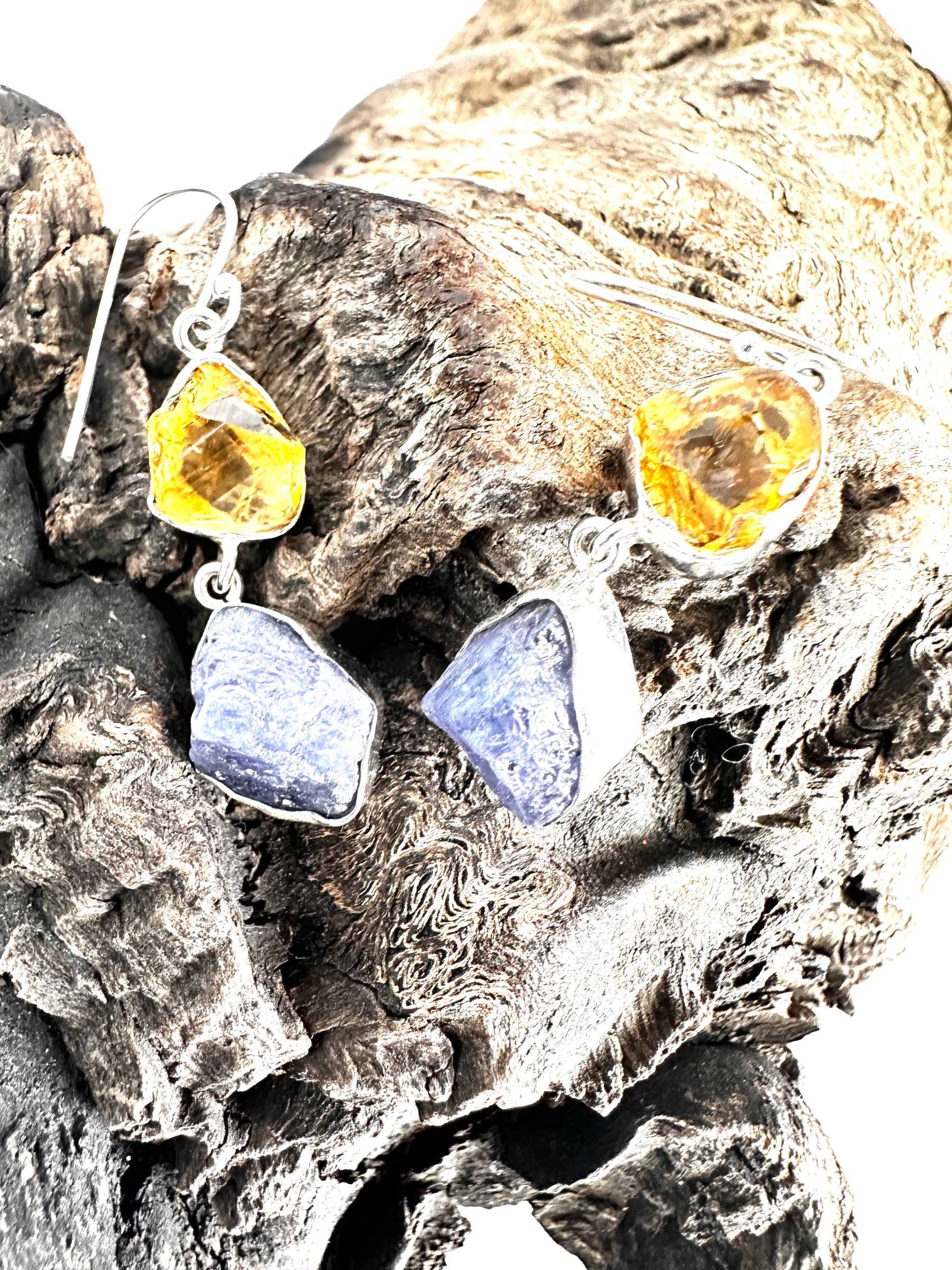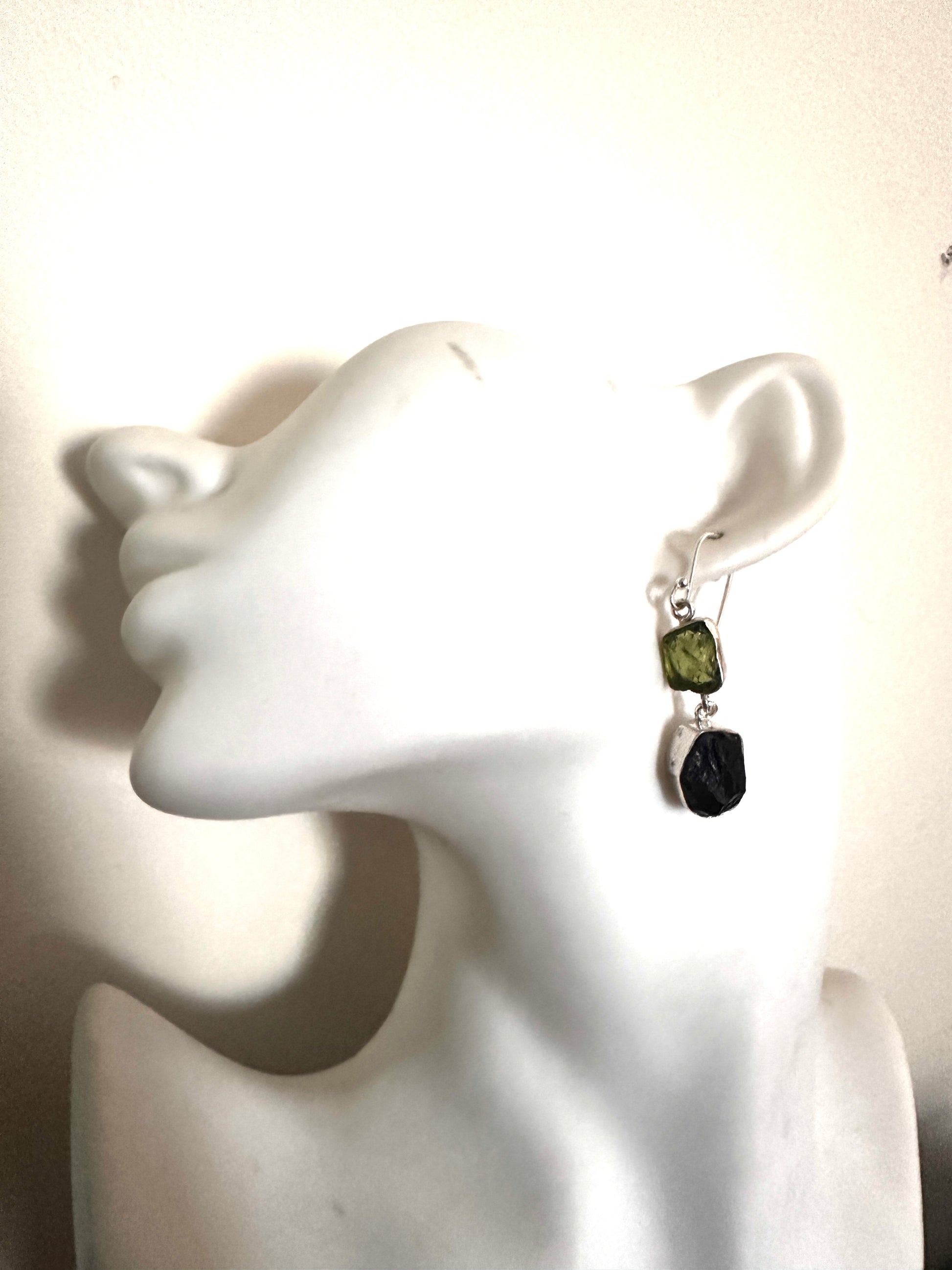 Raw Candy earrings showcase striking raw natural stones set in sterling silver, designed as elegant double drops. The naturally contrasting textures and hues highlight the organic beauty of each stone, while the sterling silver setting provides a refined, durable framework. These earrings offer a sophisticated yet earthy aesthetic, perfect for those who appreciate unique, expert-crafted jewelry that emphasizes natural individuality.