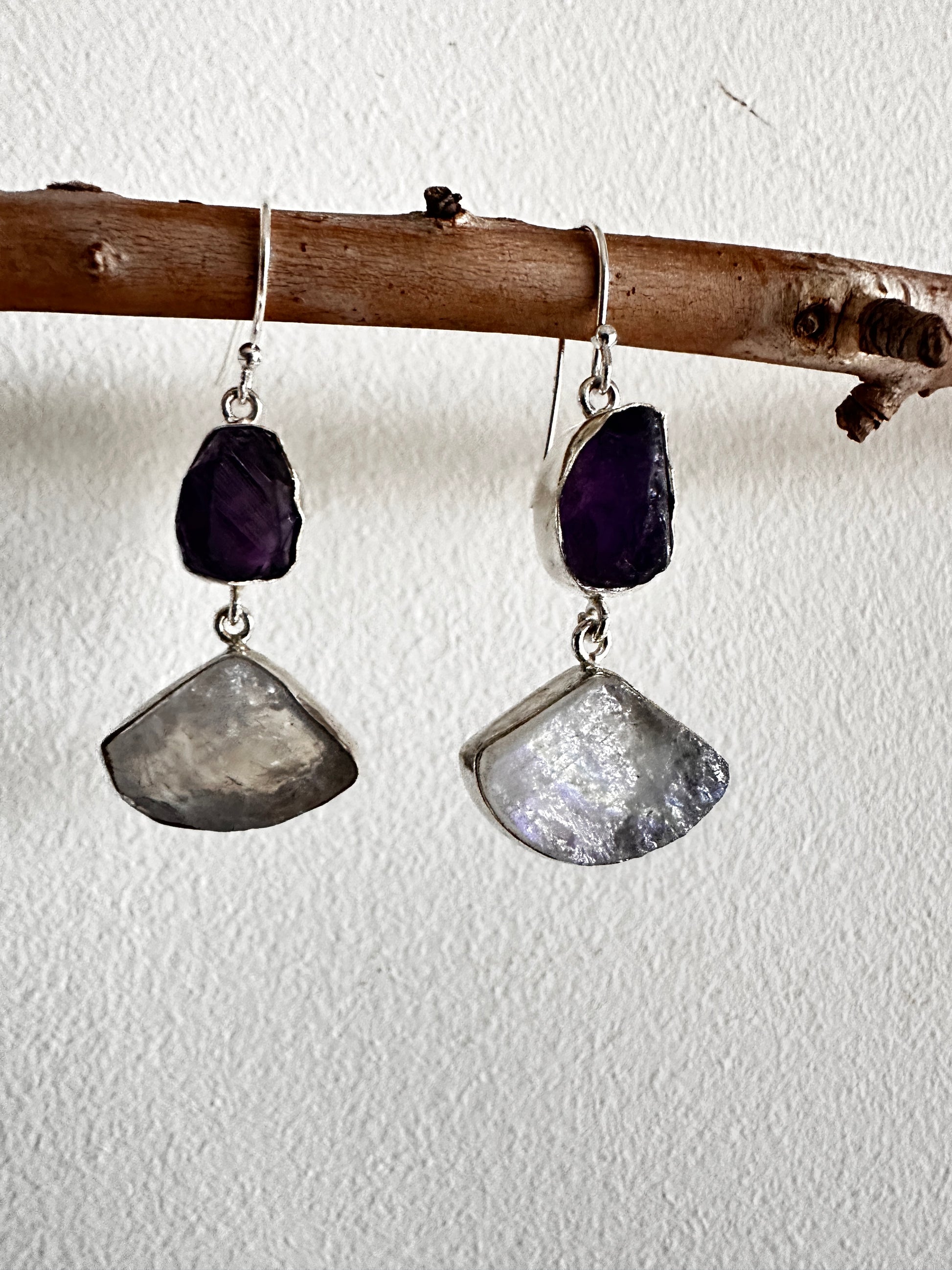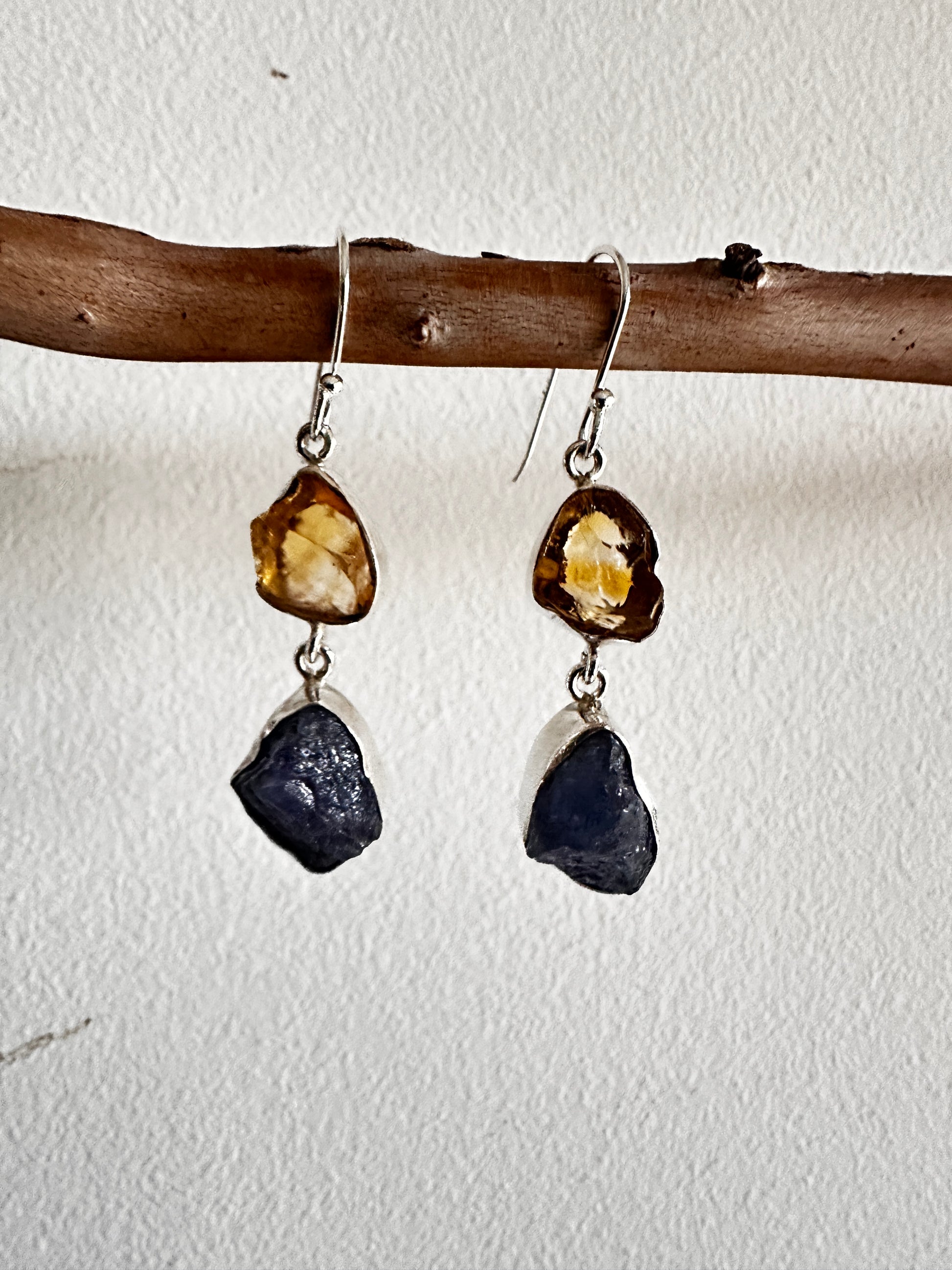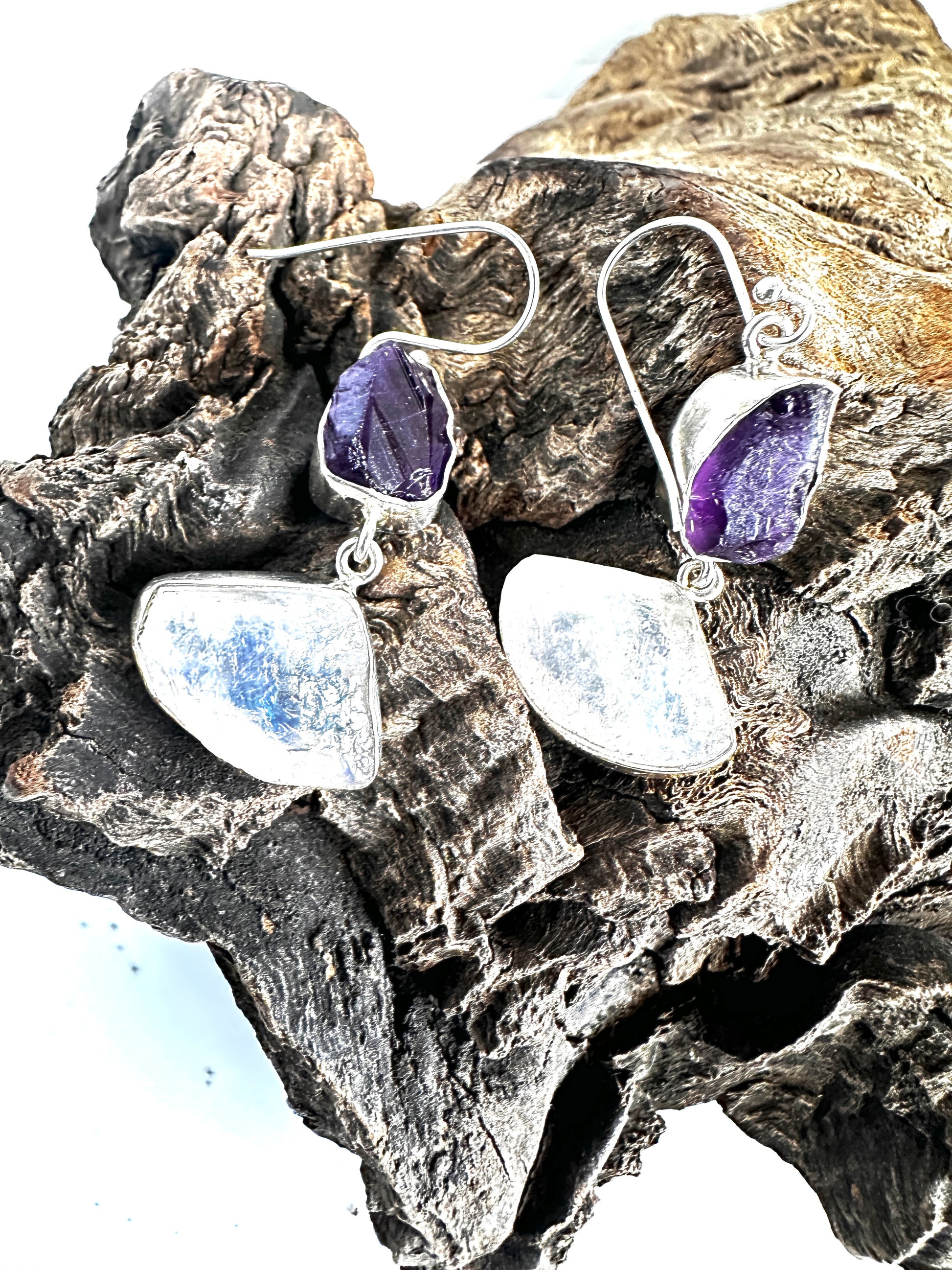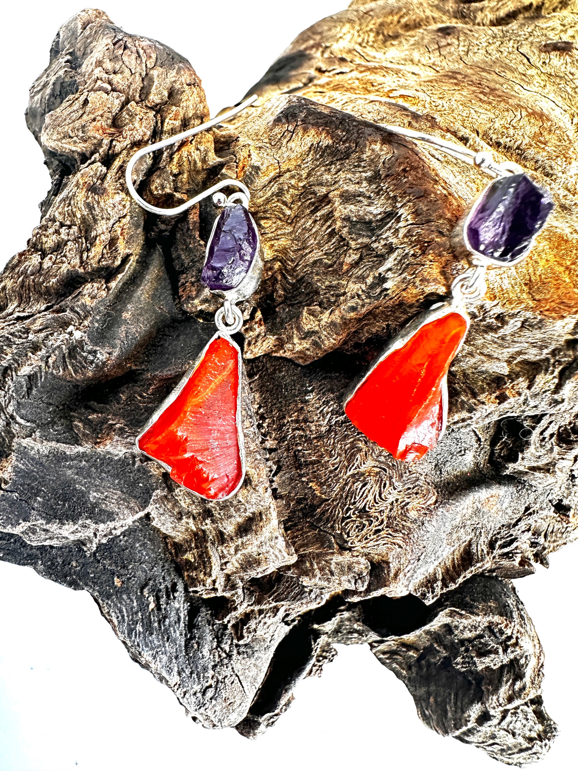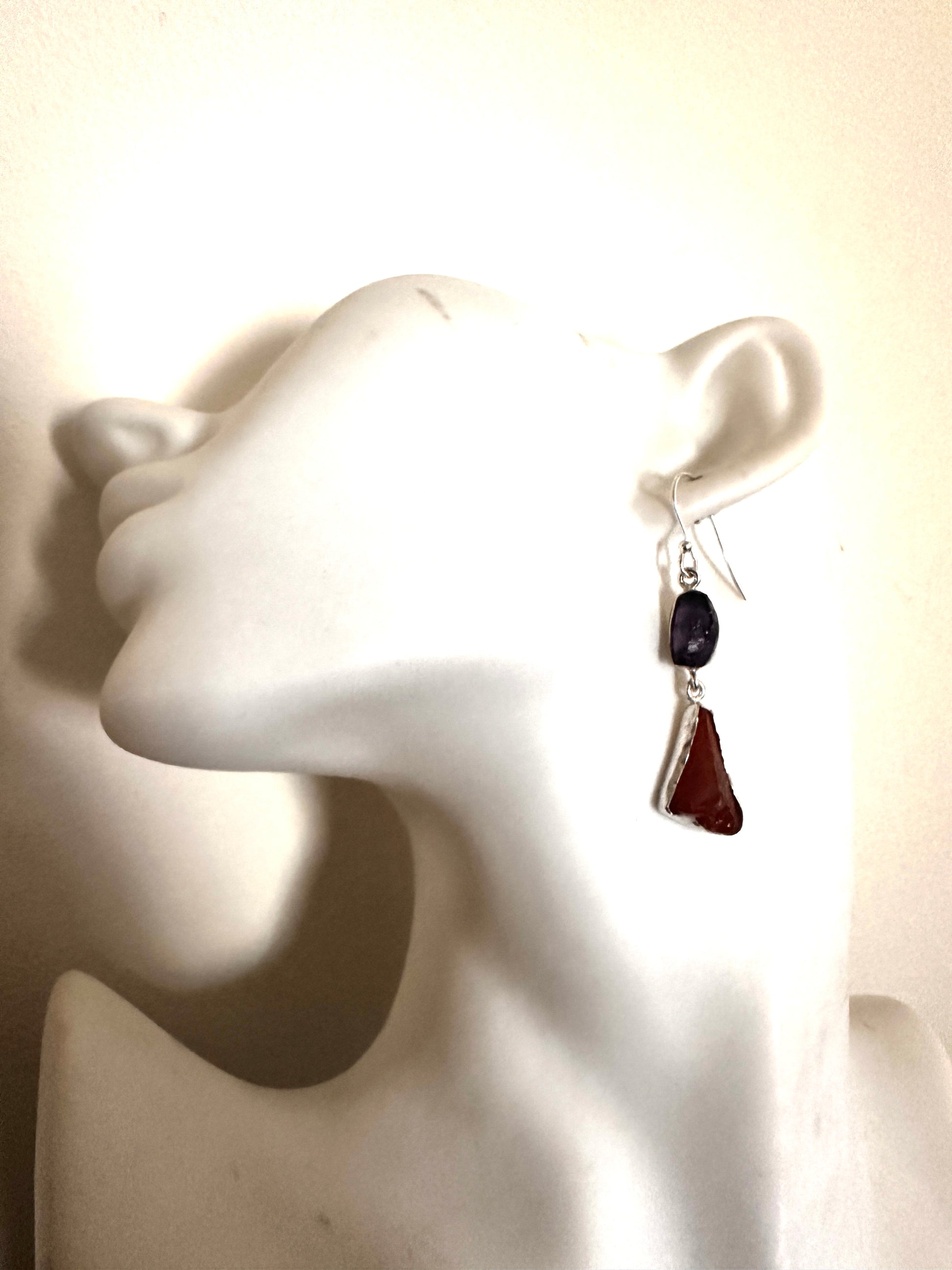 Raw Candy earrings showcase striking raw natural stones set in sterling silver, designed as elegant double drops. The naturally contrasting textures and hues highlight the organic beauty of each stone, while the sterling silver setting provides a refined, durable framework. These earrings offer a sophisticated yet earthy aesthetic, perfect for those who appreciate unique, expert-crafted jewelry that emphasizes natural individuality.
