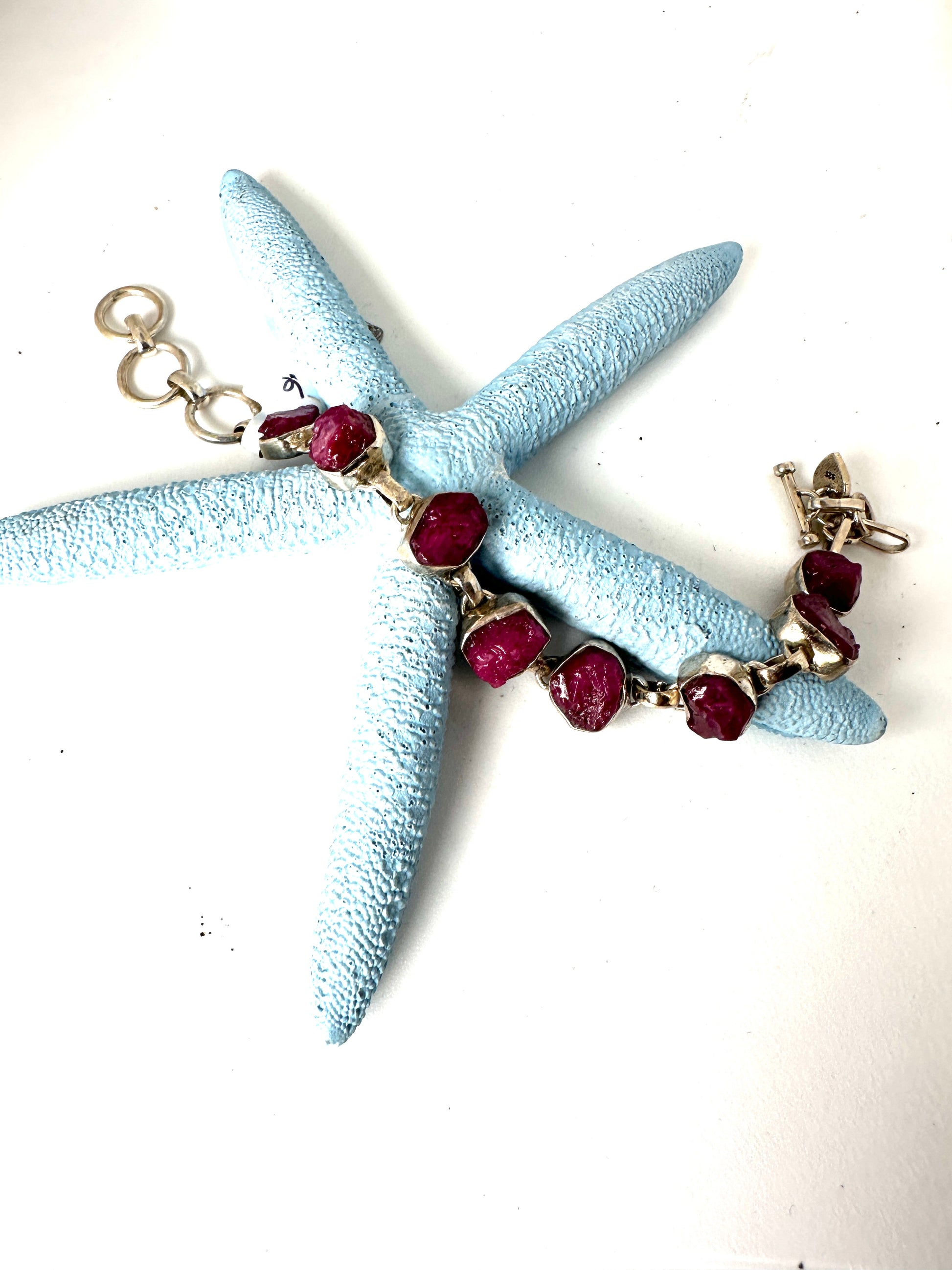This 925 silver bracelet is adorned with raw, unpolished rubies, displaying their natural beauty. With a touch of elegance and a hint of nature, this bracelet is perfect for adding a unique touch to any outfit. Expertly crafted and perfect for any occasion, it's a beautiful addition to any jewelry collection.