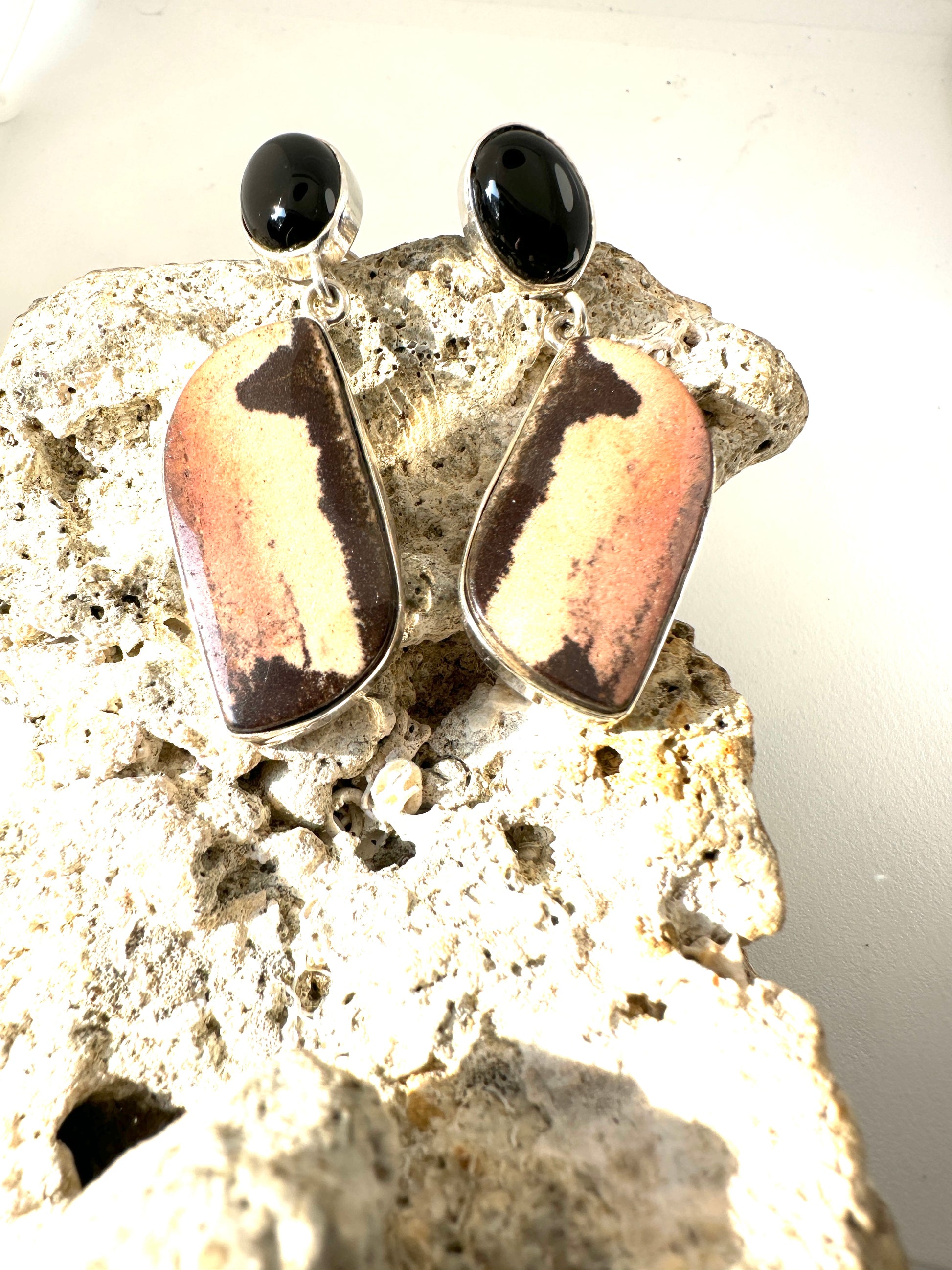 Add a touch of elegance to any outfit with our handcrafted Rhodonite with Black Onyx earrings. Made with genuine rhodonite drops and black onyx cabochon studs, these 925 sterling silver earrings are the perfect combination of style and quality. Elevate your look with the natural beauty of these gemstones.