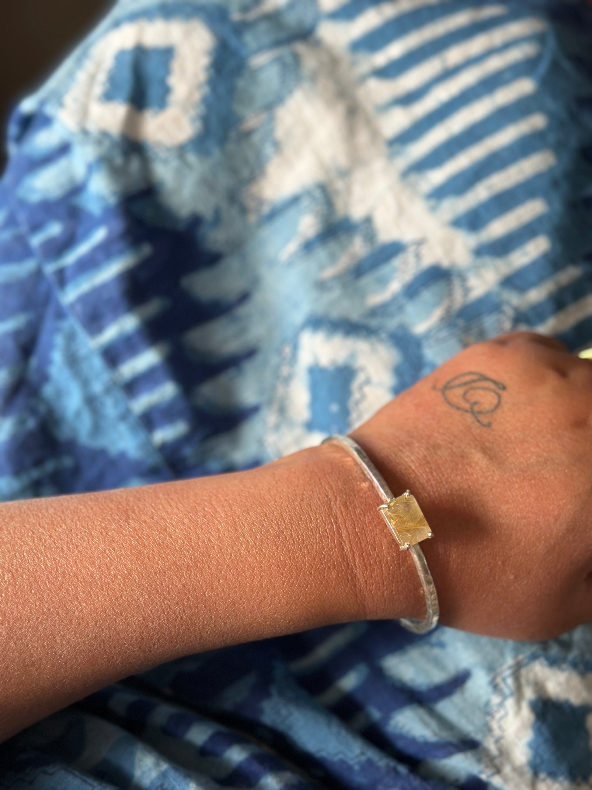 This 925 silver adjustable cuff is the perfect accessory for a minimalistic look. Featuring a single polished faceted rutile quartz, this piece adds a touch of elegance to any outfit. The adjustable design ensures a comfortable fit for all.