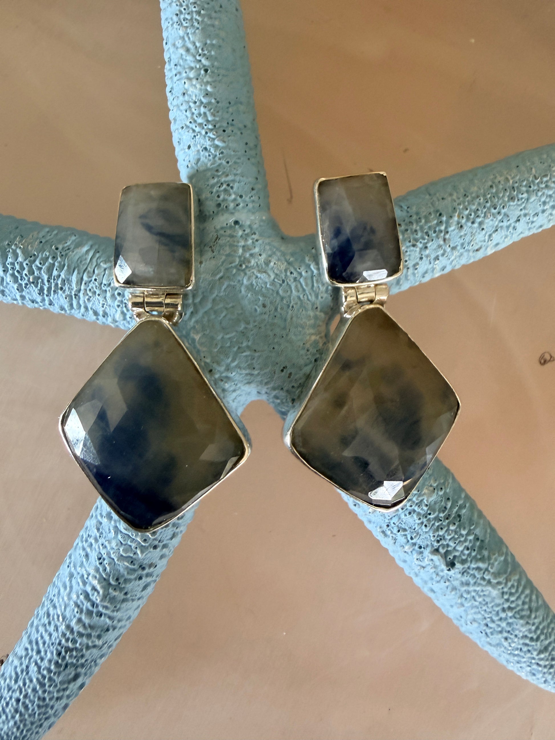 Elegant sapphire earrings featuring rectangular stud tops in blue multi-sapphire, paired with striking diamond-shaped drops in sterling silver. The contrasting shapes create dynamic movement while the cool blue tones and lustrous silver setting offer timeless sophistication. Perfect for adding refined sparkle to any occasion.