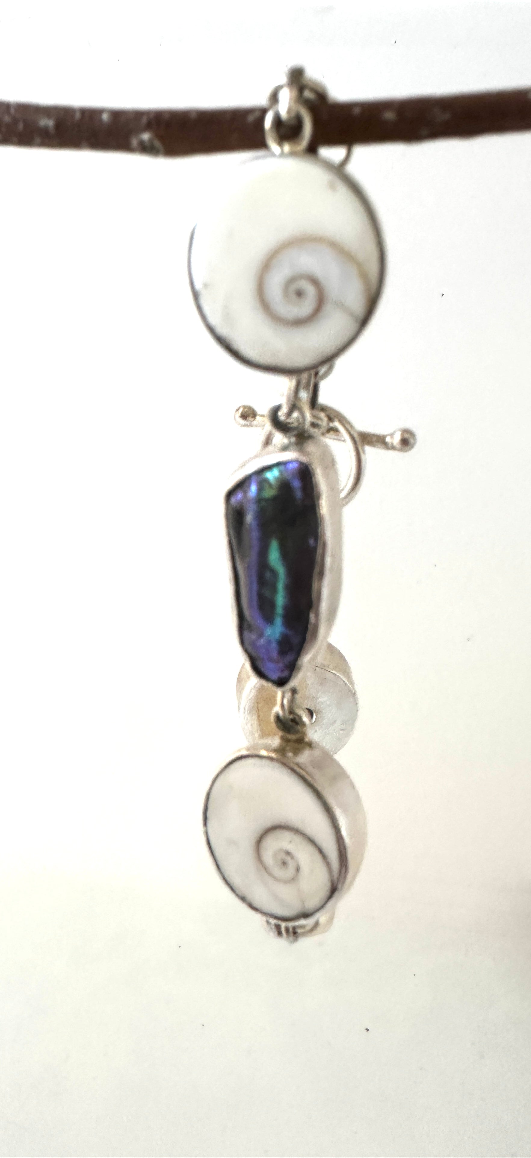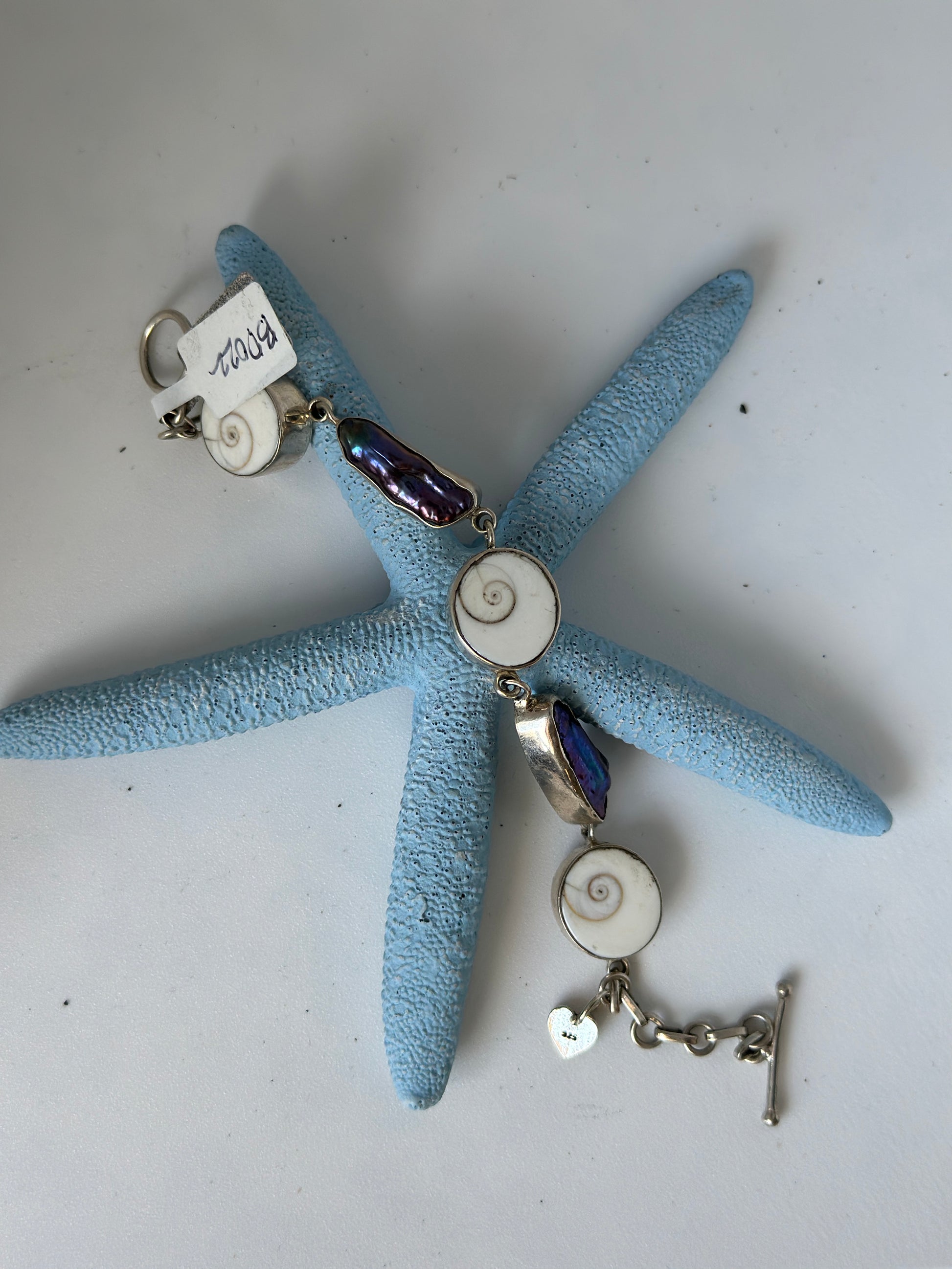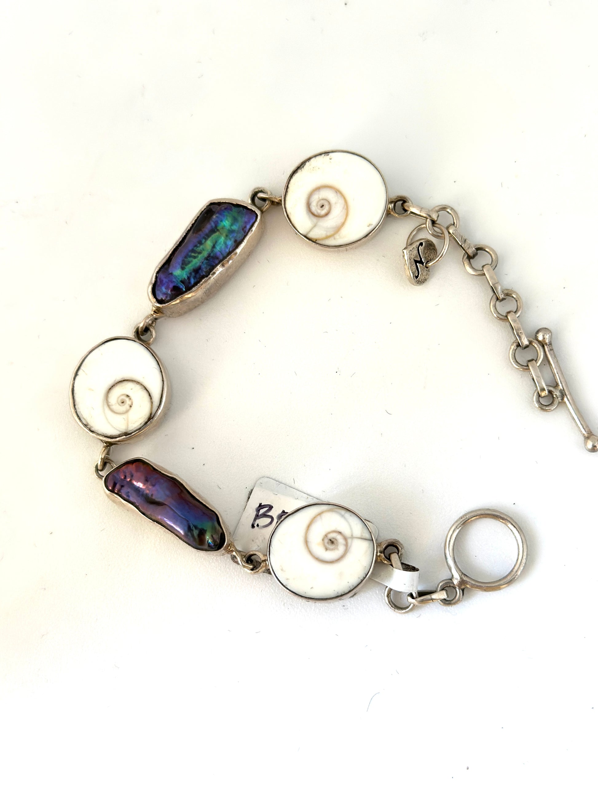 This stunning bracelet features Shiva eye and peacock Biwa Pearls, both carefully handcrafted with 925 sterling silver. The combination of these exquisite materials creates a unique and elegant piece of jewelry, perfect for any occasion. Adorn your wrist with this beautiful bracelet and add a touch of sophistication to your style.