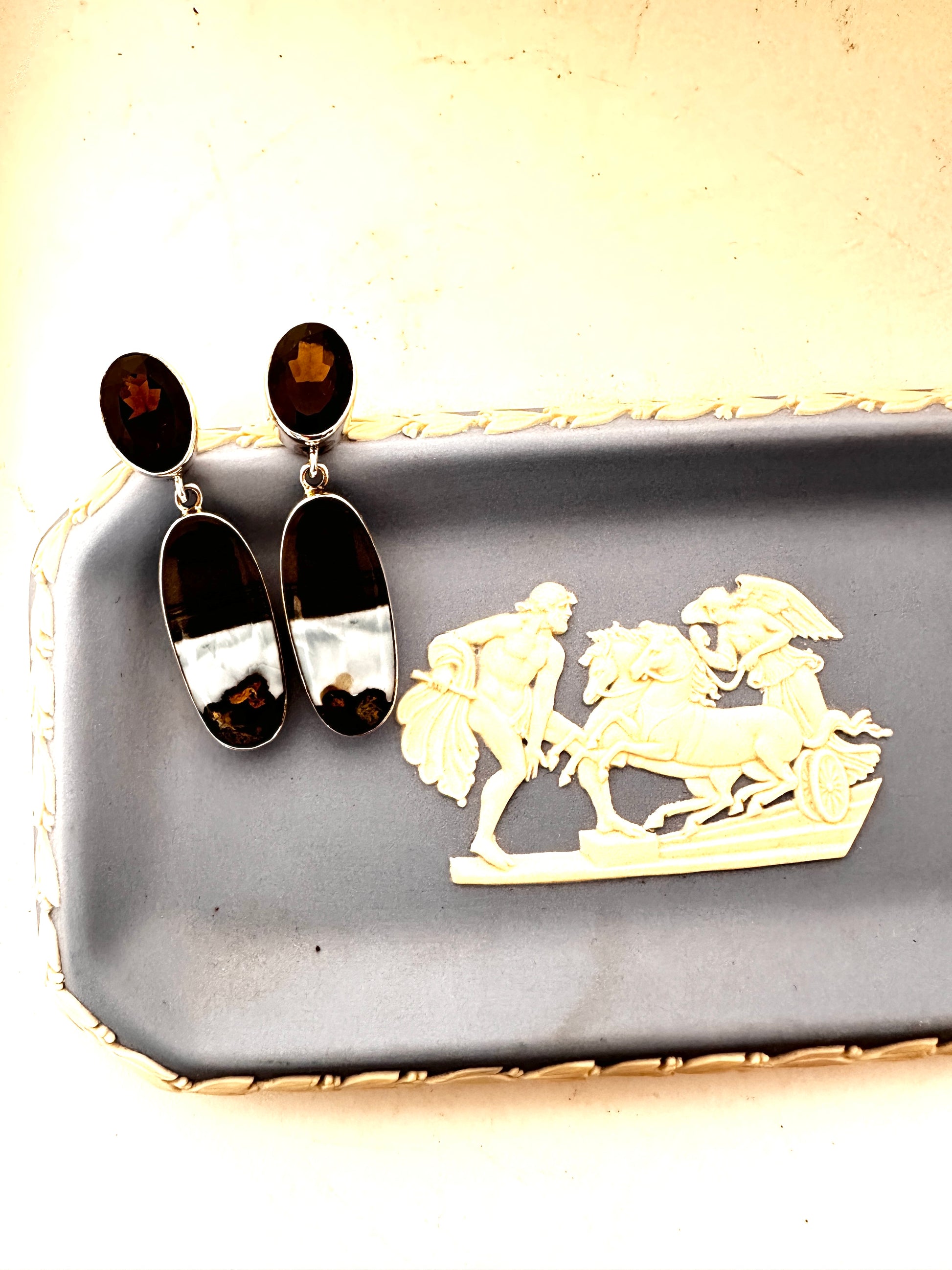 These sterling silver earrings feature smoky quartz oval studs that provide a subtle, mysterious shimmer. Hanging delicately from each stud are gorgeous oval blue banded opals, banded with distinct shades of light blue and grey, creating a captivating interplay of color and light. This combination offers a refined balance between elegance and natural beauty, making the earrings a sophisticated addition to any collection.