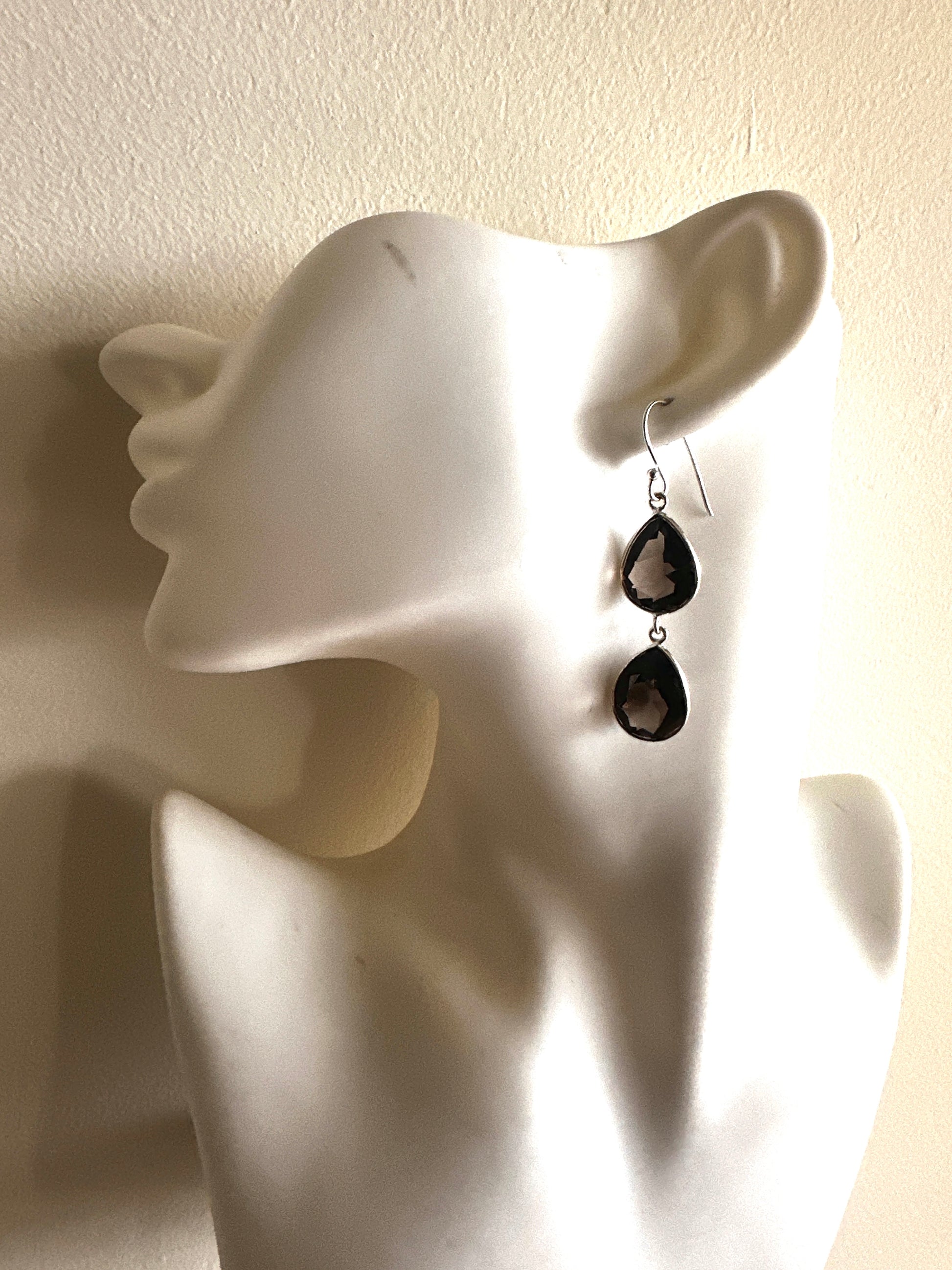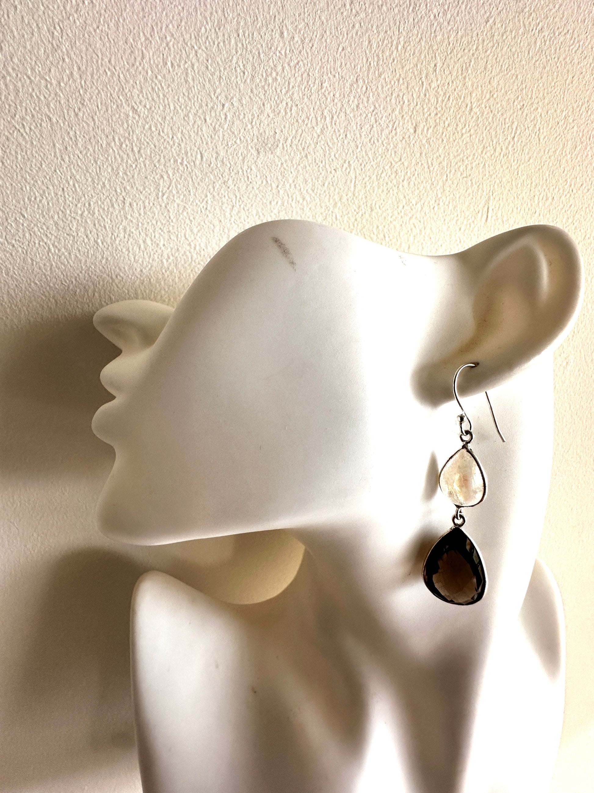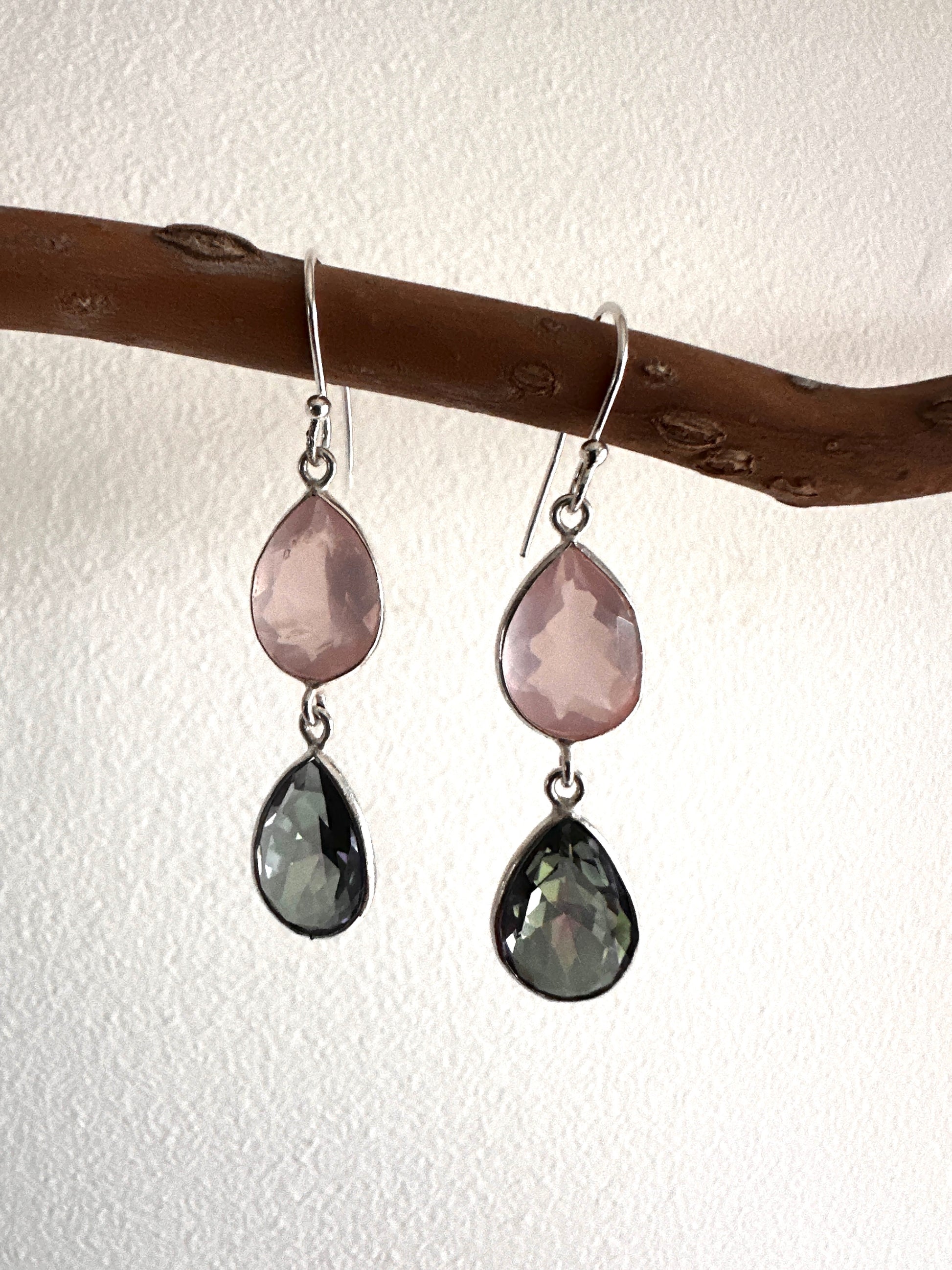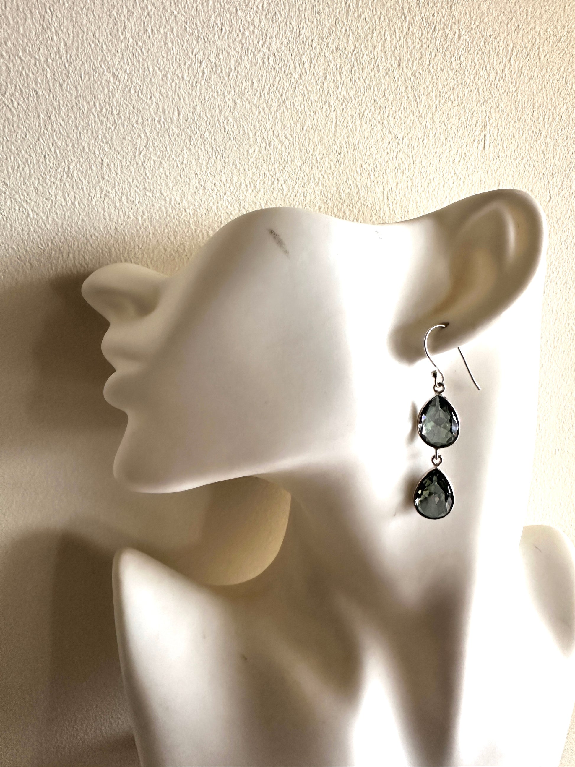 These earrings feature faceted tear-shaped stones expertly set in sterling silver, combining various stone arrangements for a refined look. Their delicate design and elegant craftsmanship make them an ideal accessory for formal occasions, adding subtle sophistication to any ensemble.