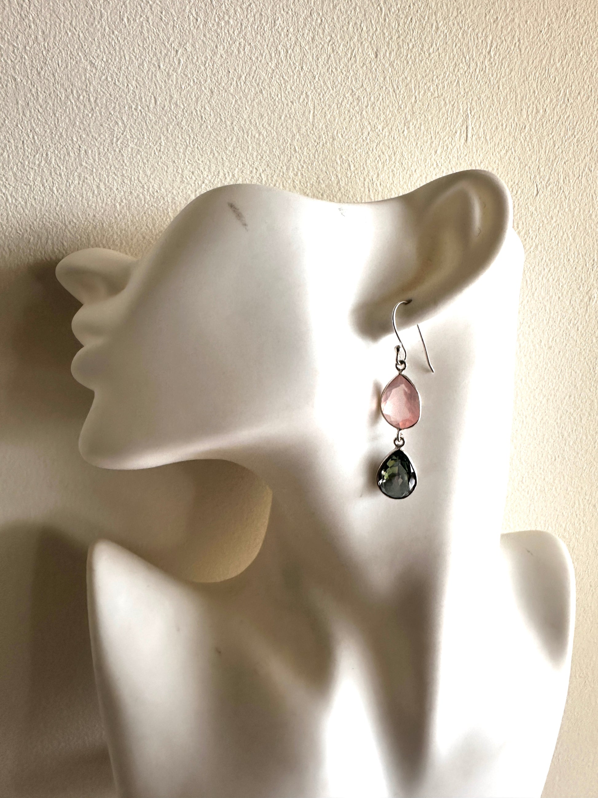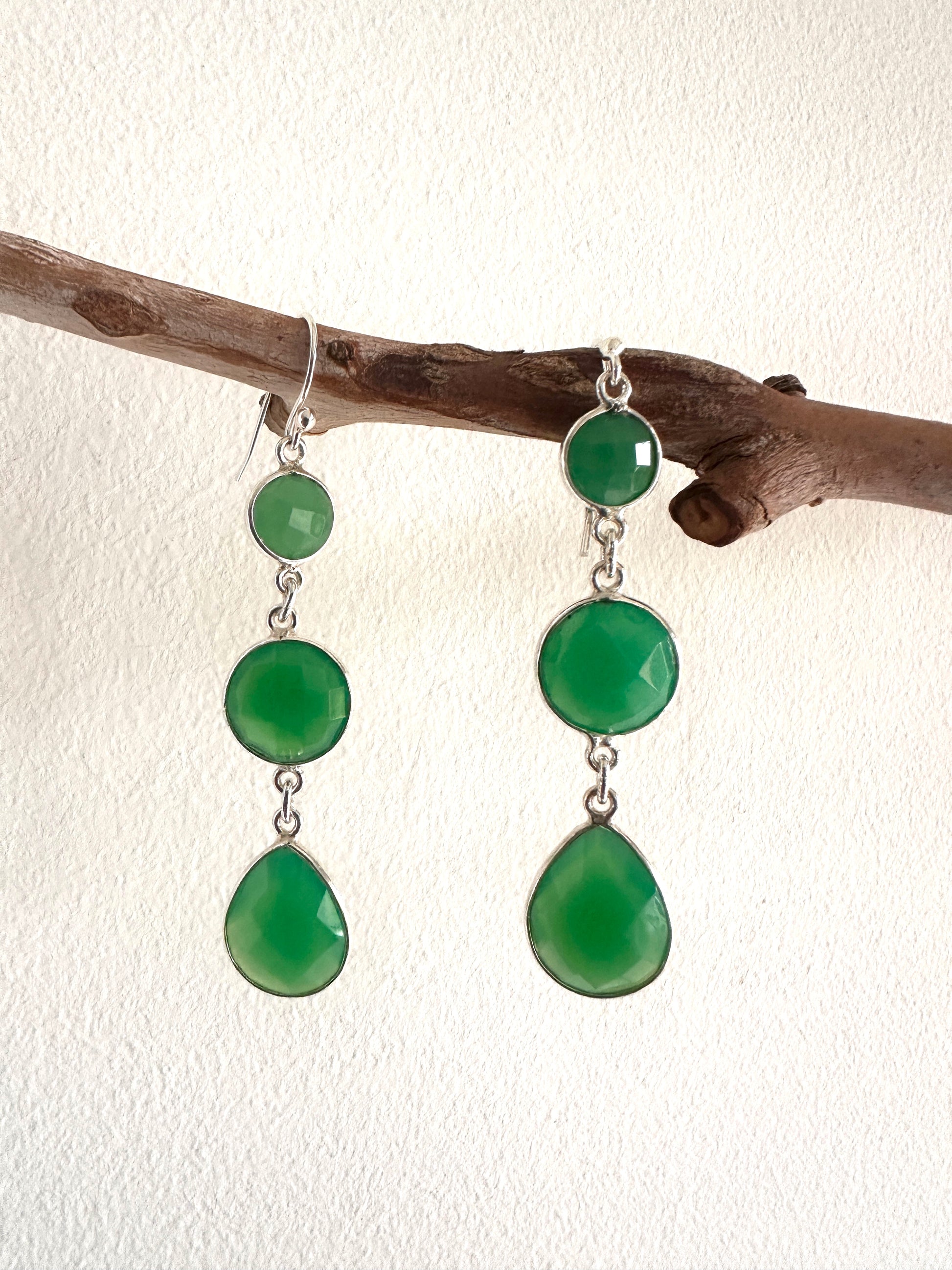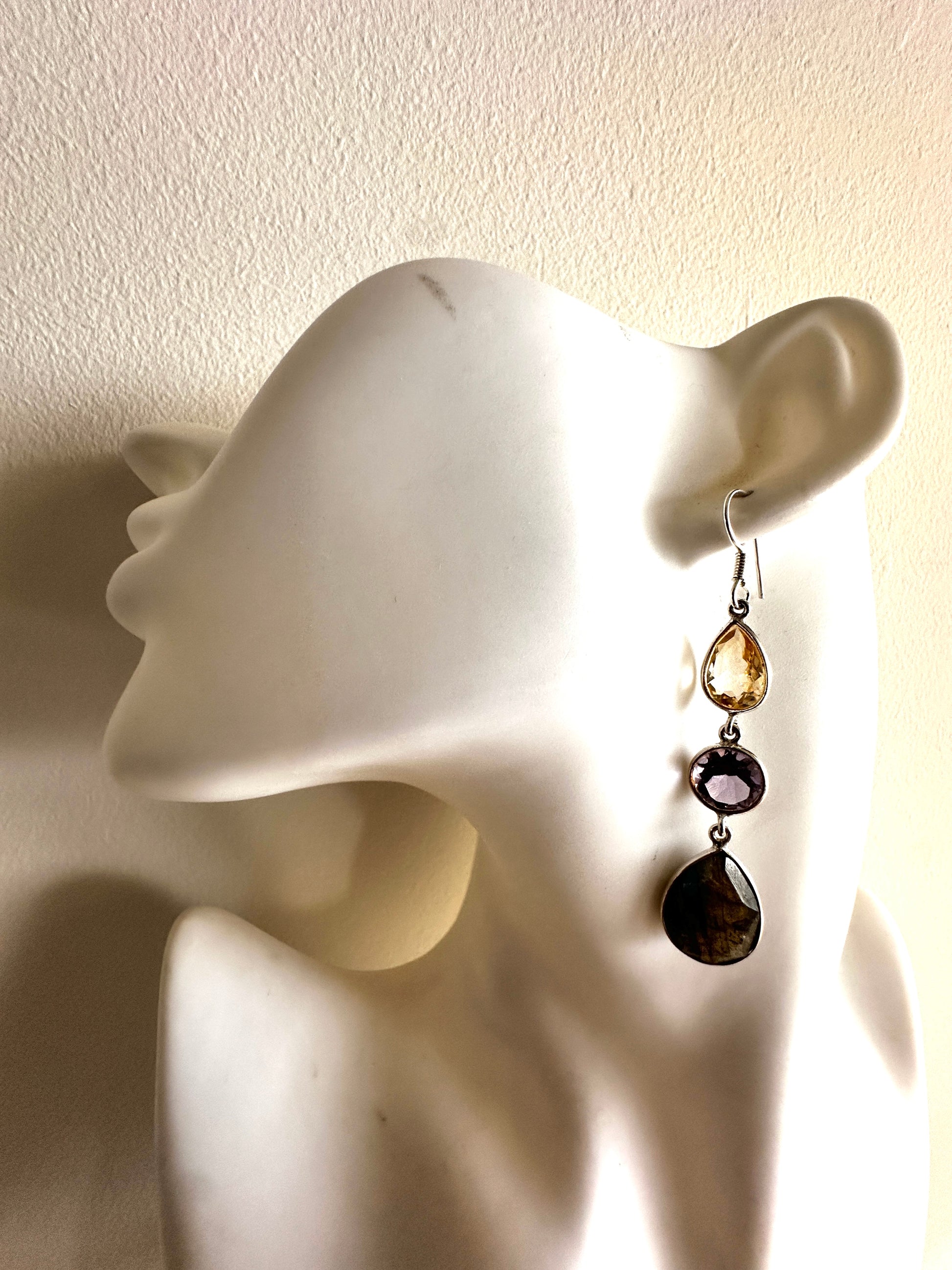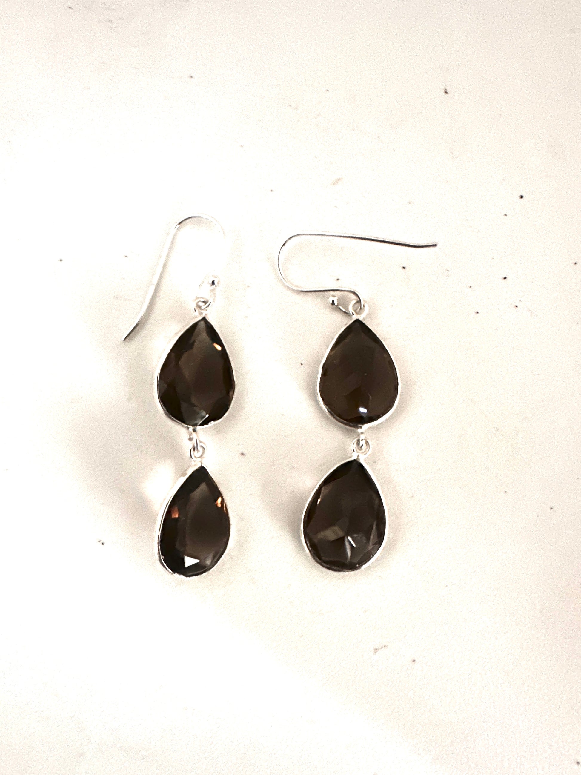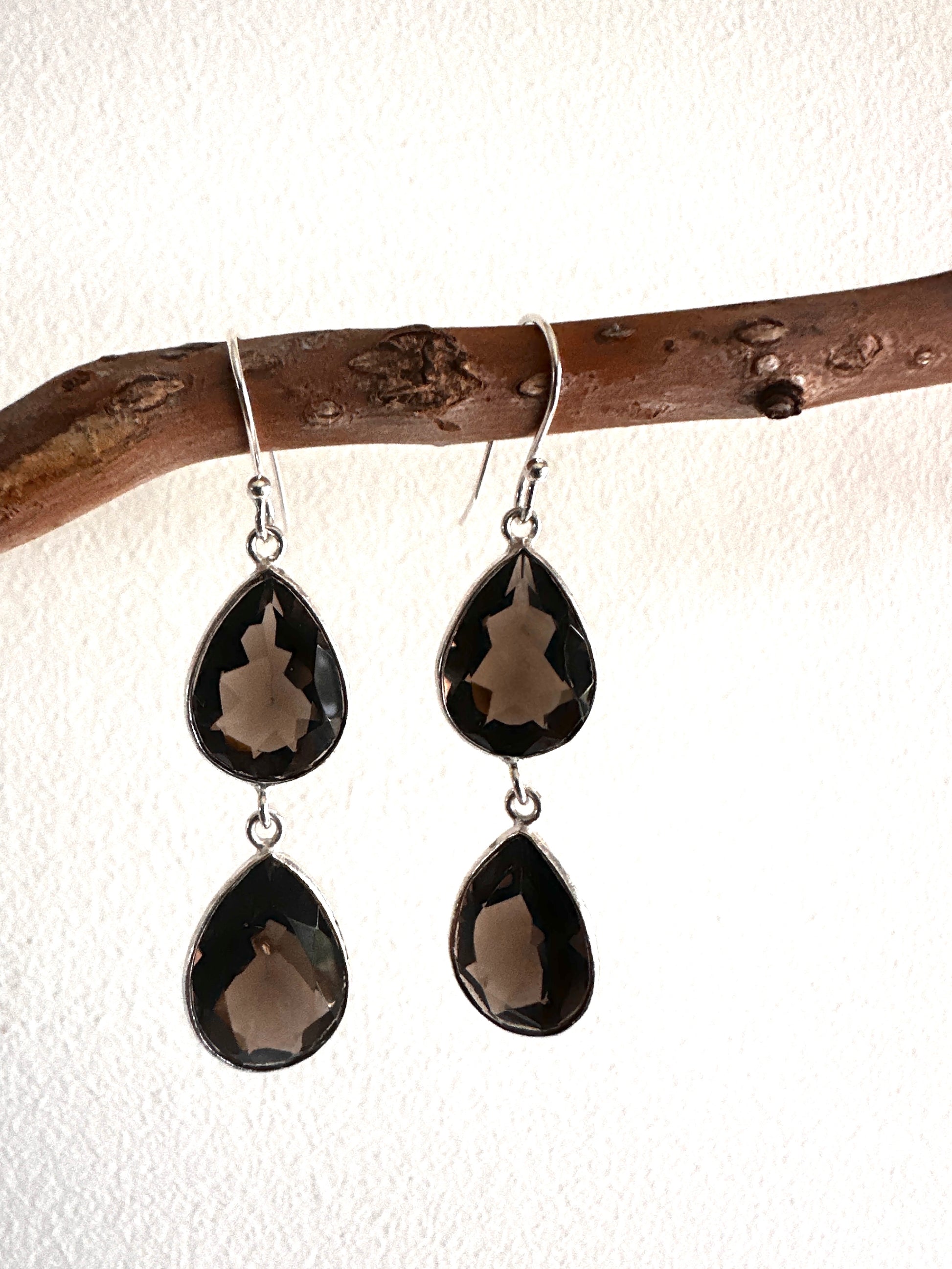 These earrings feature faceted tear-shaped stones expertly set in sterling silver, combining various stone arrangements for a refined look. Their delicate design and elegant craftsmanship make them an ideal accessory for formal occasions, adding subtle sophistication to any ensemble.