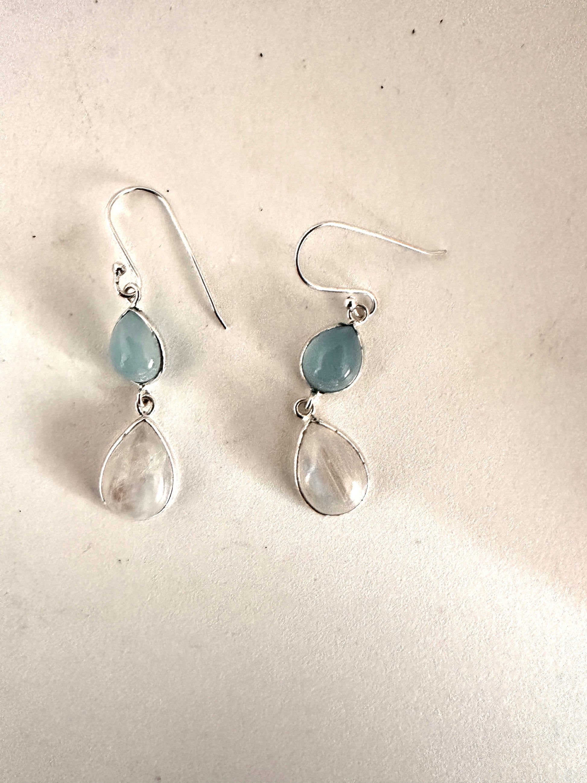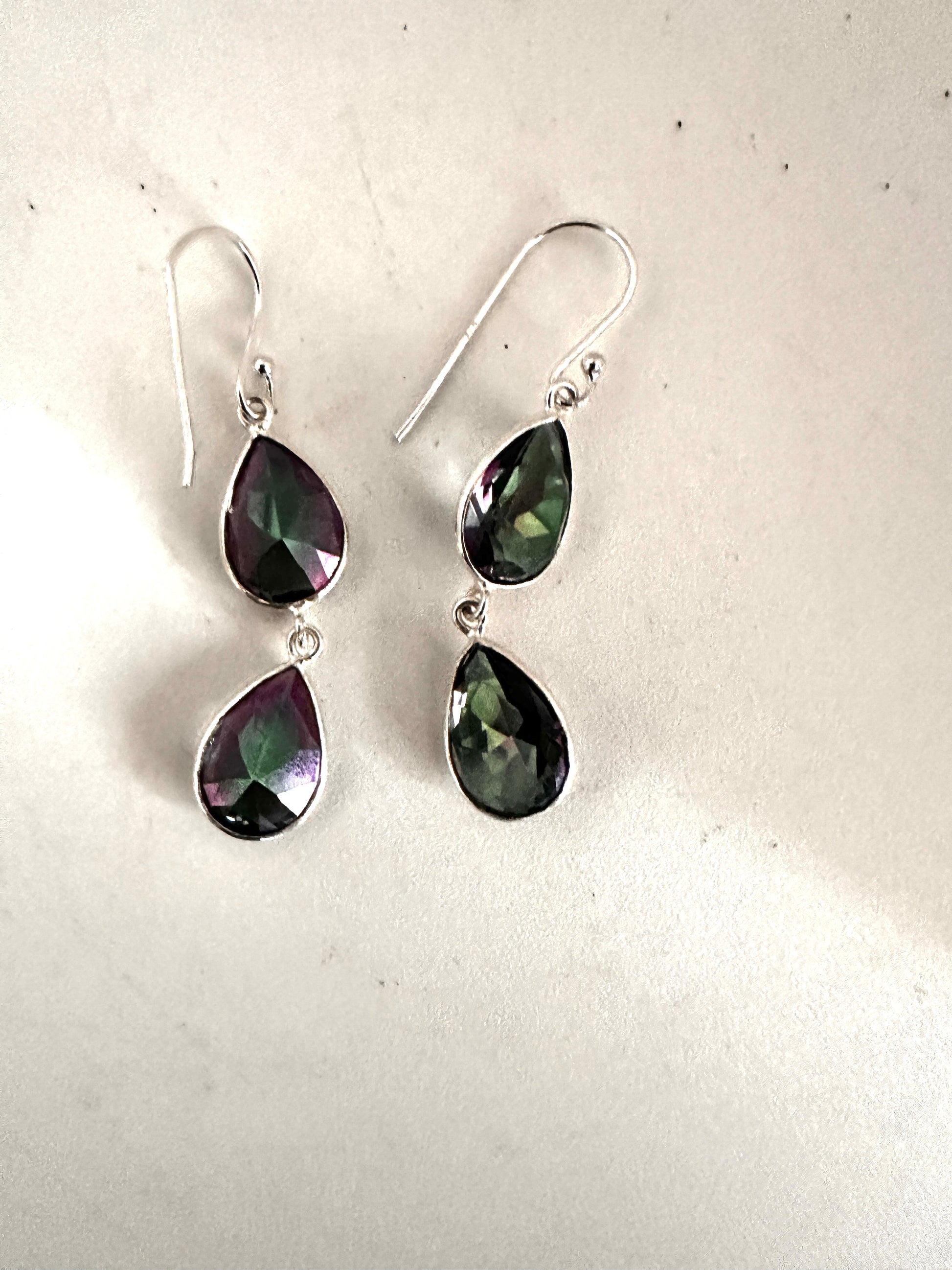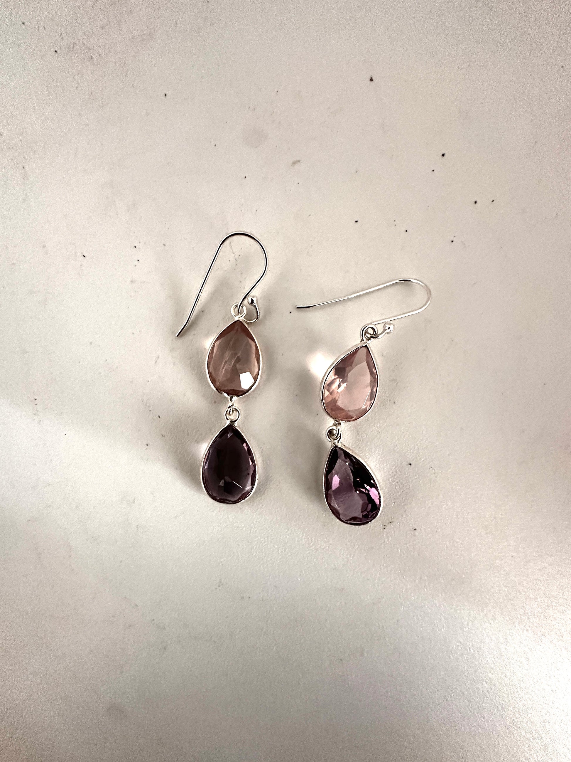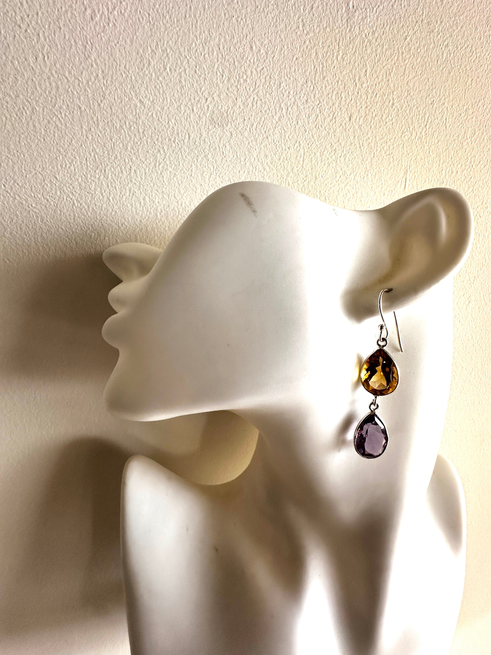 These earrings feature faceted tear-shaped stones expertly set in sterling silver, combining various stone arrangements for a refined look. Their delicate design and elegant craftsmanship make them an ideal accessory for formal occasions, adding subtle sophistication to any ensemble.