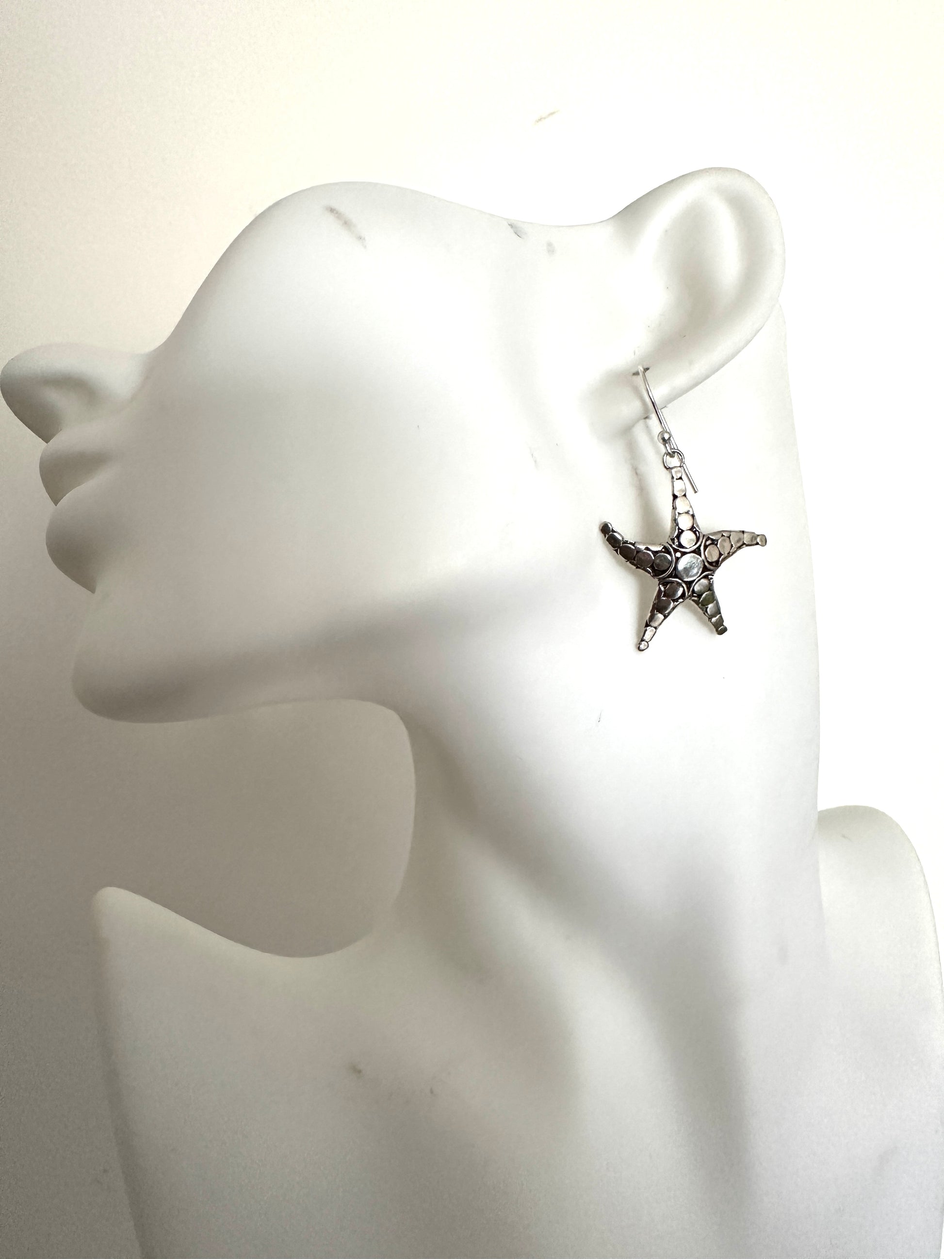 Enhance your beachy look with these elegant 925 textured starfish dangle earrings. Crafted with expert precision, these earrings are perfect for adding a touch of playful sophistication to any outfit. Let your unique style shine with the delicate charm of these starfish earrings.